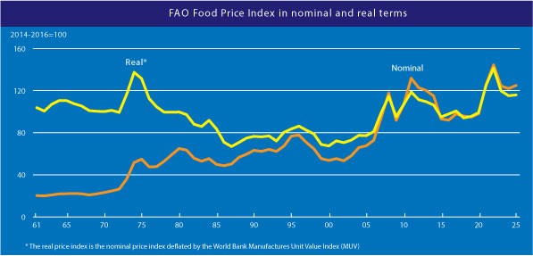 Theo báo cáo vừa công bố của Tổ chức Lương Nông Liên Hợp Quốc (FAO), giá thực phẩm thế giới ghi nhận giảm trong tháng 1/2025 với -1,6% so với tháng 12/2024, đạt trung bình 124,9 điểm. Sự sụt giảm này đến từ việc giá thịt, dầu thực vật và đường giảm đáng kể.