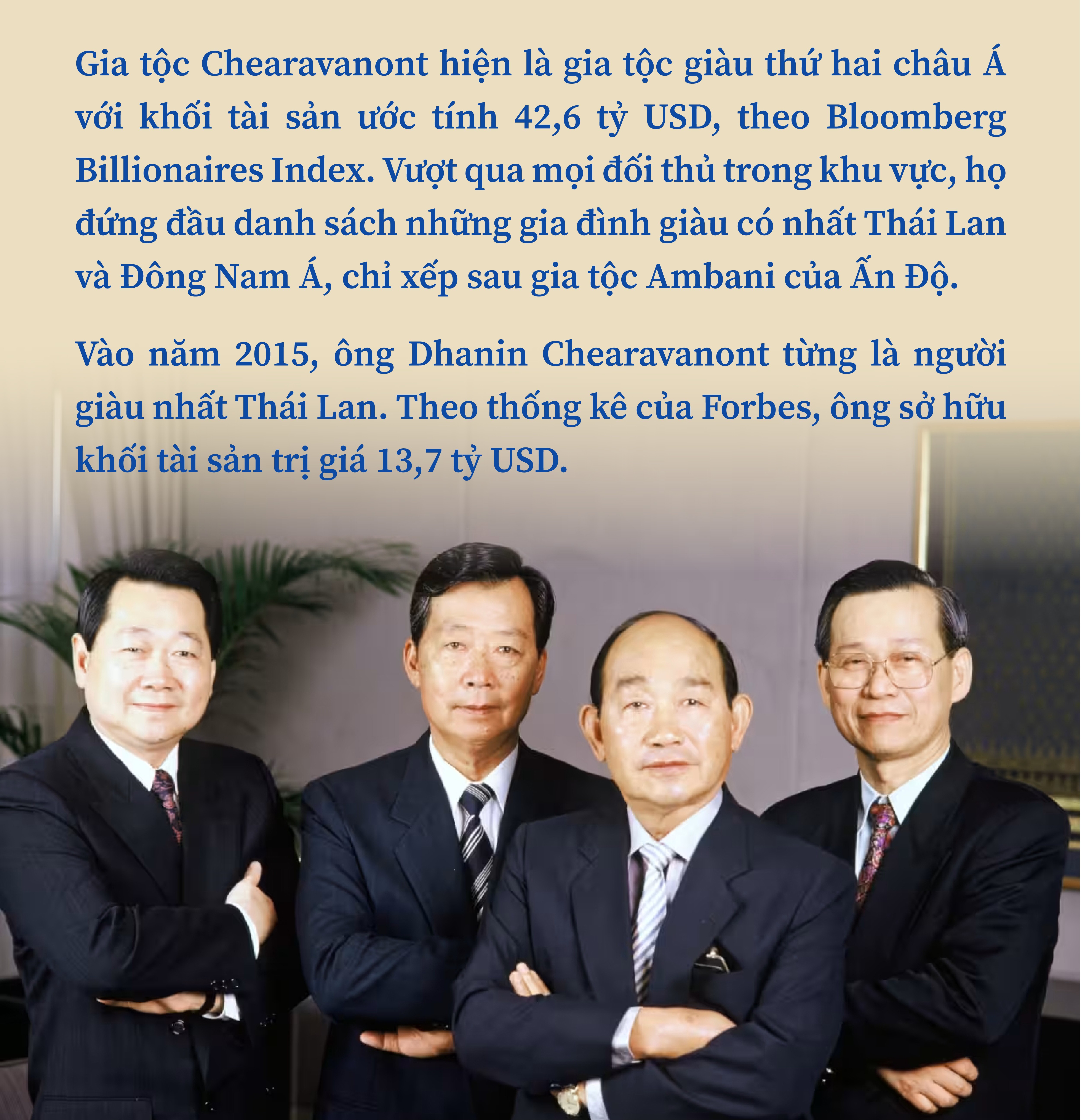 Người đặt nền móng cho CP là hai anh em Chia Ek Chor và Chia Siew Whooy. Nhưng để có được vị thế như hiện tại, vai trò nổi bật nhất thuộc về bốn người con trai nhà Chearavanont. Trong đó, nhân vật trung tâm là em út Dhanin Chearavanont, thường được coi là “kiến trúc sư trưởng” của quá trình toàn cầu hóa.