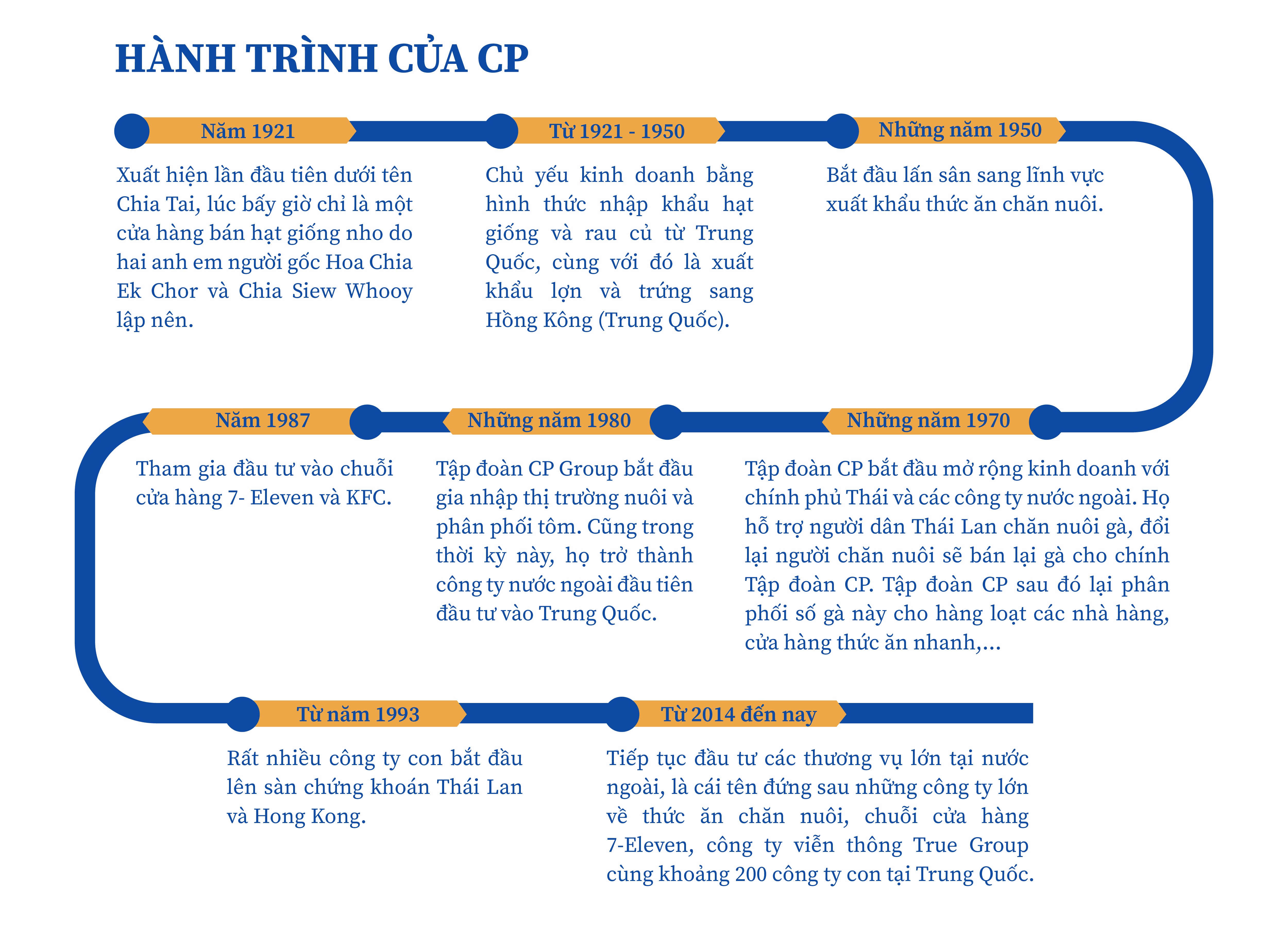 Ngay từ những ngày đầu, CP đã xây dựng các nhà máy thức ăn chăn nuôi quy mô lớn tại Đồng Nai, Bình Dương, sau đó mở rộng ra các tỉnh miền Bắc. Tiếp đó, CP đầu tư vào trang trại chăn nuôi gà, lợn, cung cấp con giống, áp dụng quy trình kiểm soát chặt chẽ về chất lượng và vệ sinh an toàn thực phẩm.