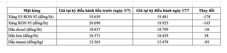 Bình quân giá thành phẩm xăng dầu thế giới giữa kỳ điều hành giá ngày 10/7/2025 và kỳ điều hành ngày 17/7/2025 là: 78,01 USD/thùng xăng RON 92, giảm 0,90 USD/thùng, tương đương giảm 1,15%; 79,70 USD/thùng xăng RON 95, giảm 0,77 USD/thùng, tương đương giảm 0,96%; 86,62 USD/thùng dầu hỏa, tăng 0,42 USD/thùng, tương đương tăng 0,49%; 89,18 USD/thùng dầu diesel, giảm 0,12 USD/thùng, tương đương giảm 0,13%; 416,39 USD/tấn dầu mazut, giảm 2,53 USD/tấn, tương đương giảm 0,60%.