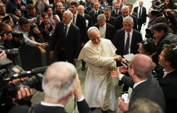 Giáo hoàng Leo XIV có cuộc gặp mặt chính thức đầu tiên với các phóng viên đến từ nhiều quốc gia ở khán phòng Paul VI tại Tòa thánh Vatican. |