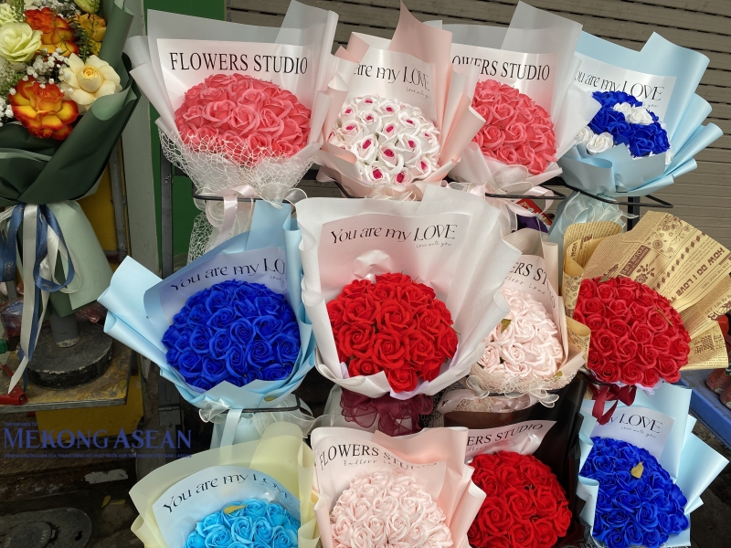 | Hoa sáp, hoa lụa 'hút' khách dịp 8/3 năm nay do giá cả hợp lý và độ bền. Ảnh: Hà Anh/Mekong ASEAN. |