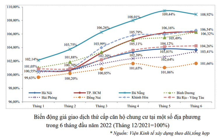 Giá giao dịch thứ cấp căn hộ chung cư tại các địa phương tiếp tục có xu hướng tăng đều theo quý. Trong đó, so với 6 tháng cuối năm 2021, căn hộ bình dân là phân khúc có mức tăng cao nhất tại cả khu vực Hà Nội và TP HCM (giá giao dịch căn hộ bình dân tại Hà Nội tăng khoảng 5,6%, tại TP HCM tăng khoảng 5,3%). Đối với căn hộ trung cấp tại Hà Nội, giá giao dịch trong 6 tháng đầu năm 2022 tăng cao ở một số khu vực như: Hai Bà Trưng, Long Biên, Gia Lâm.