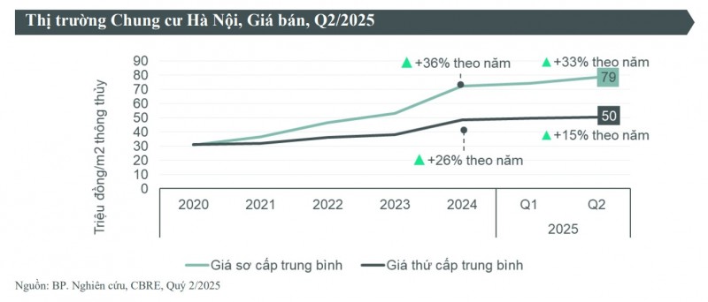 Do cơ cấu nguồn cung mới quý này tập trung vào phân khúc cao cấp, giá bán sơ cấp trung bình tại thời điểm cuối quý 2/2025 đạt khoảng 79 triệu đồng/m2 thông thủy, tăng 6% theo quý và 33% so với cùng kỳ năm trước.