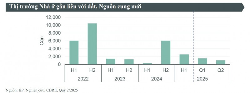 Cũng theo báo cáo của CBRE, trong quý 2/2025, thị trường Hà Nội ghi nhận hơn 1.000 căn nhà thấp tầng được mở bán, giảm 32% so với quý trước nhưng cao gấp 5 lần so với cùng kỳ năm 2024. Lũy kế 6 tháng đầu năm, tổng nguồn cung nhà thấp tầng mới đạt hơn 2.500 căn, tăng gấp gần 9 lần so với cùng kỳ năm ngoái, dù vẫn chưa bằng một nửa con số của nửa cuối năm 2024.