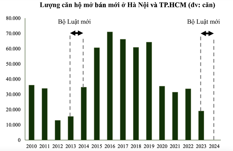 | Trong quá khứ, việc ban hành các bộ luật mới trong giai đoạn 2013-2014 đã góp phần thúc đẩy mạnh mẽ nguồn cung dự án và hoạt động giao dịch trong các năm tiếp theo. Nguồn: VCBS |
