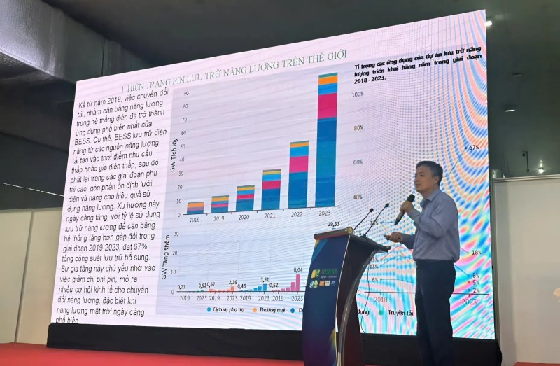 Phát biểu tại hội thảo, TS Dư Văn Toán, chuyên gia về năng lượng tái tạo (Bộ Nông nghiệp và Môi trường) cho biết, hệ thống pin tích trữ năng lượng (BESS) giúp tích trữ điện dư thừa trong giờ thấp điểm và phát lại khi nhu cầu cao, từ đó ổn định lưới điện và tối ưu hóa khai thác các nguồn năng lượng như điện gió, điện mặt trời.