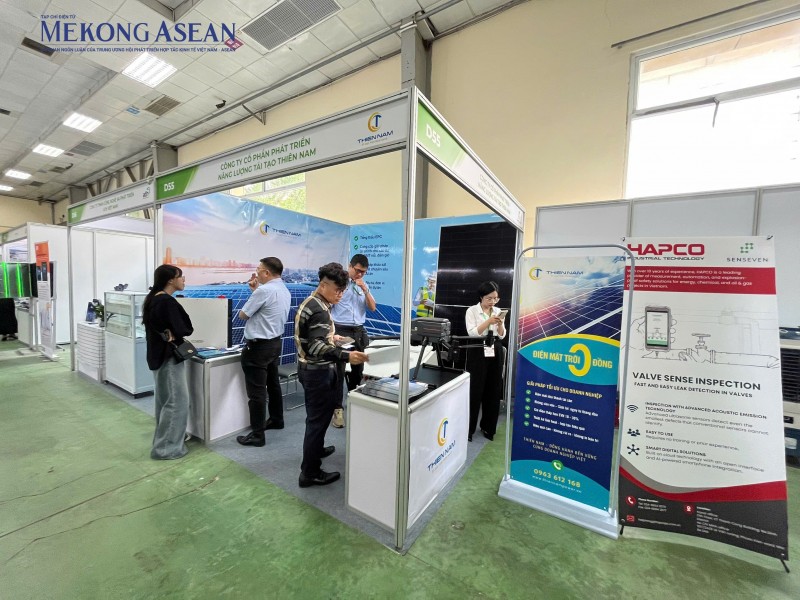 | Nhiều doanh nghiệp cung cấp giải pháp điện mặt trời tham gia trưng bày tại Entech Hanoi 2025. Ảnh: Thu Thảo/Mekong ASEAN. |