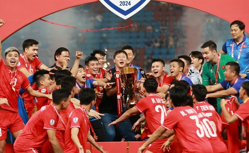 | HLV Kim Sang-sik dẫn dắt ĐT Việt Nam giành vô địch giải Mitsubishi Electric ASEAN Cup 2024. Ảnh: VFF |
