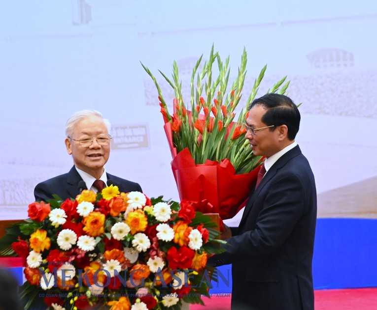 | Bộ trưởng Bùi Thanh Sơn tặng hoa Tổng Bí thư Nguyễn Phú Trọng. Ảnh: Đỗ Thảo - Mekong ASEAN |