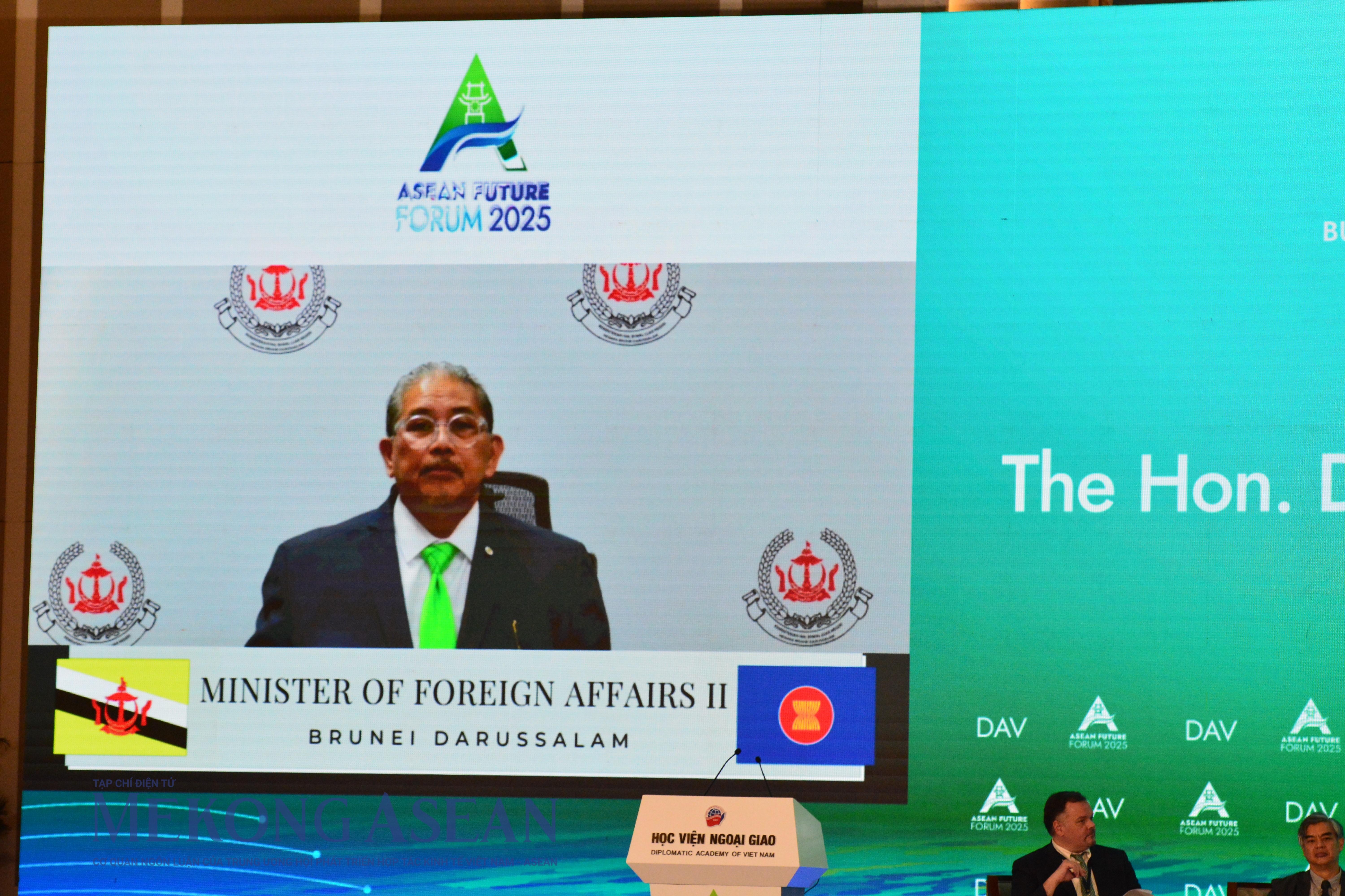 | Thông điệp ghi hình của Bộ trưởng Ngoại giao thứ hai Brunei Dato Erywan Pehin Yusof được trình chiếu trước các diễn giả tại Phiên thứ ba của AFF. Ảnh: Lê Hồng Nhung/Mekong ASEAN |