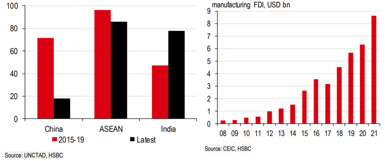 ASEAN đã vượt qua Trung Quốc đại lục trong hai năm liên tiếp về thu hút FDI. Ấn Độ cũng đang tìm được chỗ đứng cho mình, nhất là về đầu tư mới, thay vì tái đầu tư. Trong khi đó, các nhà sản xuất từ Trung Quốc đại lục cũng đang tăng cường đầu tư vào các nền kinh tế khác, đặc biệt là ở ASEAN.