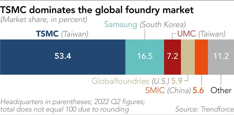Nikkei Asia trích dẫn báo cáo của công ty nghiên cứu Trendforce cho biết, thị phần của TSMC chiếm hơn 53% thị trường xưởng đúc toàn cầu trong 6 tháng đầu năm nay. TSMC chủ yếu sản xuất chip cho những đơn vị lớn như Apple, Qualcomm, Nvidia hay Broadcom.