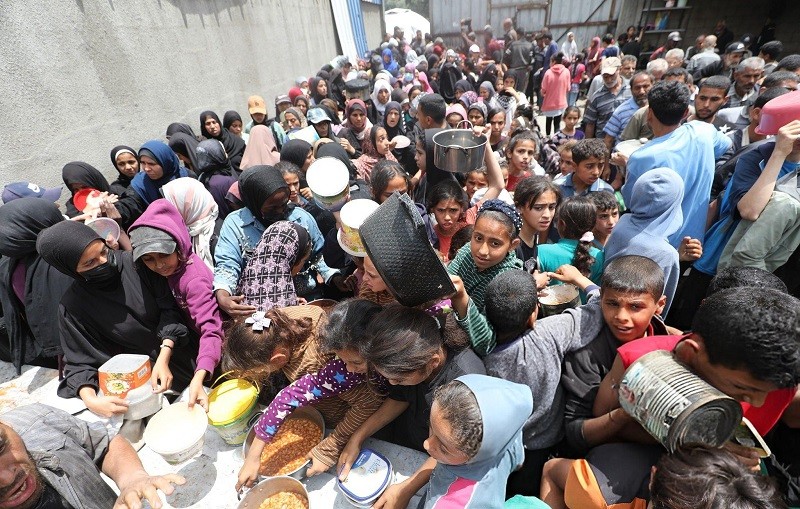 | Người dân tại Dải Gaza chờ viện trợ lương thực ngày 15/5. Ảnh: Anadolu |