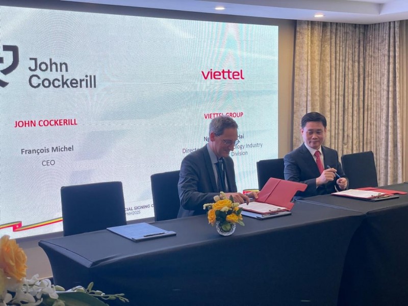 | Ông François Michel, Tổng giám đốc điều hành John Cockerill và ông Nguyễn Mạnh Hải, Giám đốc Ban quản lý công nghiệp công nghệ cao của Tập đoàn Công nghiệp - Viễn thông Quân đội Viettel ký kết biên bản ghi nhớ hợp tác. |