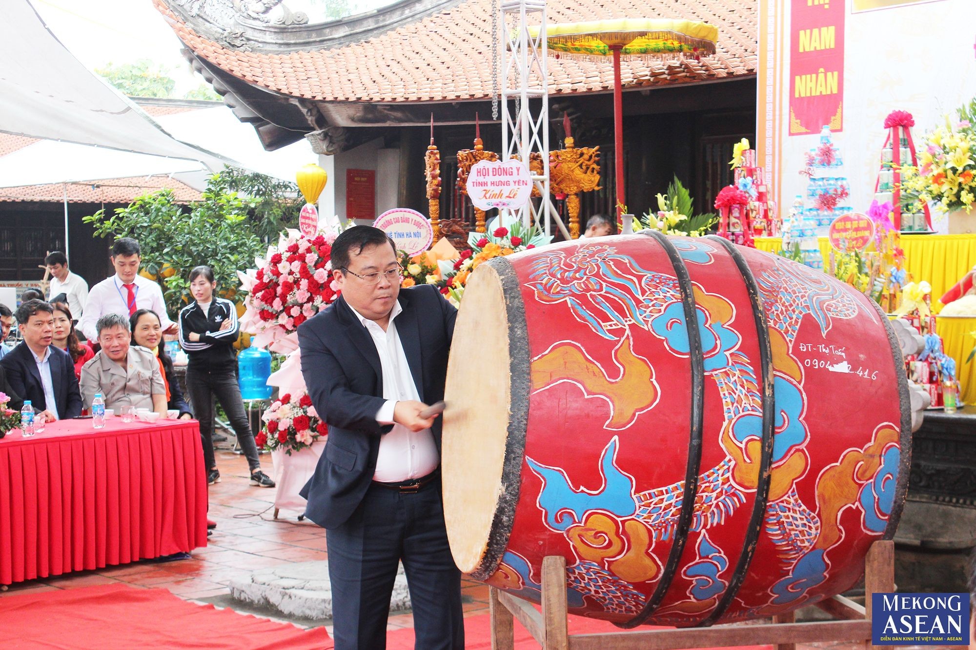 | Ông Ngô Quang Giáp, Tỉnh ủy viên, Bí thư Huyện ủy Cẩm Giàng gióng trống khai hội. |