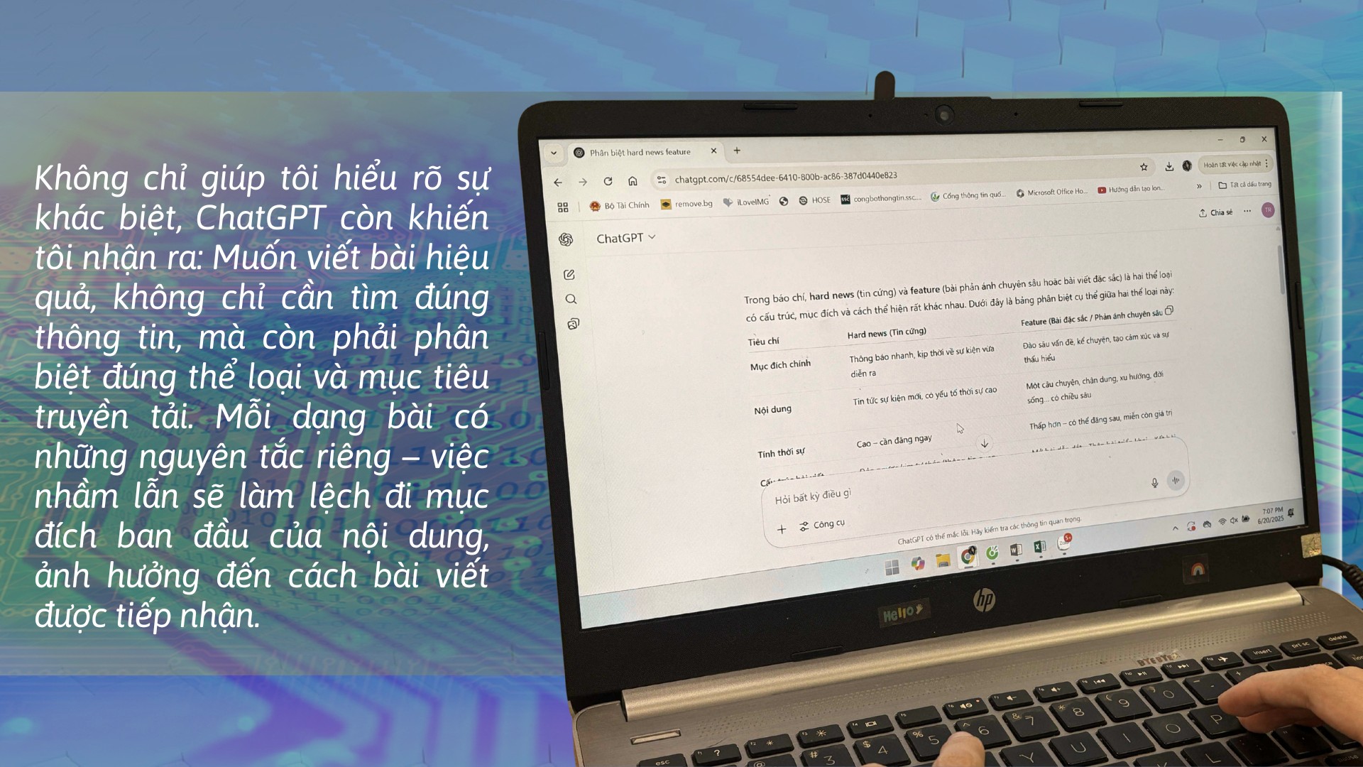 Chỉ trong vài giây, ChatGPT đưa ra câu trả lời dễ hiểu: Hard news là kiểu đưa tin ngắn gọn, tập trung vào các yếu tố 5W1H, không thêm thắt cảm xúc hay bình luận. Còn feature là kiểu bài kể chuyện, cho phép người viết khai thác chiều sâu, cảm xúc, bối cảnh. Thậm chí “nó” còn chỉ ra từng đoạn một, đâu là hard news, đâu là feature. Lúc đó, tôi mới thực sự hiểu mình sai ở đâu.