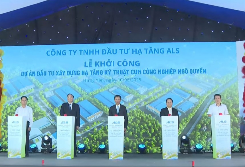 | Các đại biểu thực hiện nghi thức mấm nút khởi công dự án đầu tư xây dựng hạ tầng kỹ thuật Cụm công nghiệp Ngô Quyền. Ảnh: HYTV. |