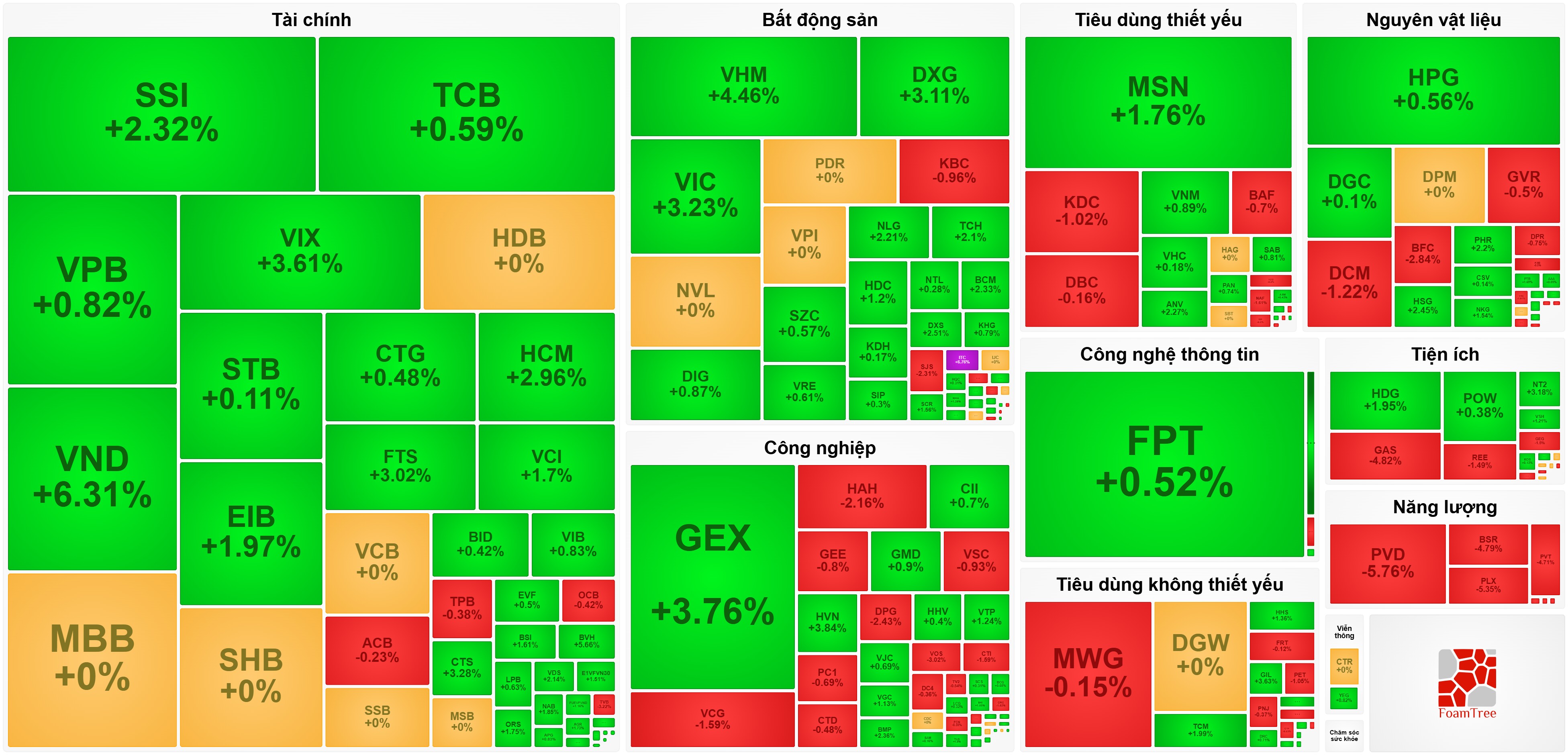 Xét về nhóm ngành, bất động sản có phiên giao dịch đáng nhớ hơn cả. Dẫn đầu bởi các ông lớn VHM và VIC, hàng loạt cổ phiếu bất động sản đồng khởi như CSC (6,5%), LDG (3,7%), DXG (3,1%), IDC (2,6%), DXS (2,5%), NLG (2,2%), HDG (1,9%), TCH (2,1%), VGC (1,1%), CRE (1%), HDC (1,2%).