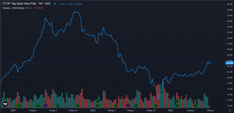 Phiên sáng 27/6, cổ phiếu HPG của Tập đoàn Hòa Phát tiếp tục tăng nhẹ lên mức giá 25.200 đồng/cp. Tính từ cuối tháng 5 tới nay, mã đã tăng 19%; còn tính từ vùng đáy tháng 11/2022, HPG đã tăng tới 108%.