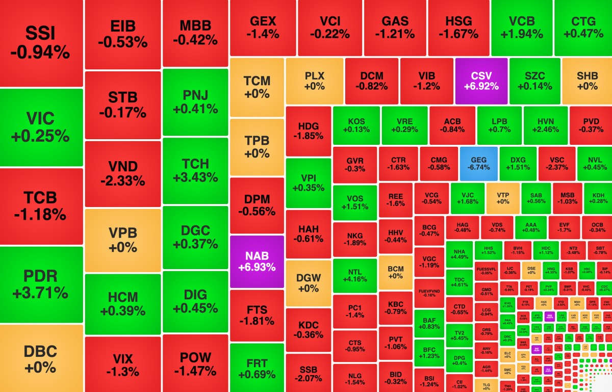 Các nhóm ngành khác diễn biến phân hoá với tỷ lệ điều chỉnh của các cổ phiếu không lớn. Một số mã tăng mạnh là CSV của nhóm phân bón tăng trần, VGI của nhóm viễn thông tăng 6,6%.
