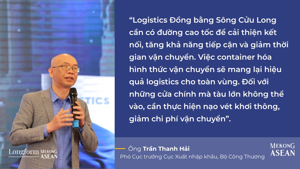 Chia sẻ với MEKONG ASEAN về hiện trạng logistics khu vực Đồng bằng Sông Cửu Long, ông Trần Thanh Hải, Phó Cục trưởng Cục Xuất nhập khẩu, Bộ Công Thương cho biết, vùng này có hệ thống cảng trải dài trên khu vực sông Hậu và sông Tiền với 5 tuyến hành lang đường bộ nối đồng bằng với vùng Đông Nam Bộ và cả nước.