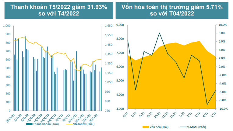 Kết thúc tháng 5, vốn hóa toàn thị trường giảm 5,71% so với thời điểm cuối tháng 4/2022, còn 6,72 triệu tỷ đồng cho cả 3 sàn. Giá trị giao dịch bình quân đạt tương đương 770,24 triệu USD/ phiên, giảm 31,93% so với tháng 4. Thanh khoản cũng sụt giảm trong bối cảnh thị trường giảm sâu, tâm lý tiêu cực bao trùm và không có nhiều thông tin hỗ trợ.