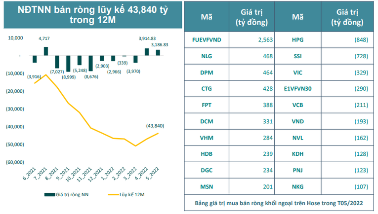Lũy kế khối ngoại bán ròng 9/12 tháng gần nhất với giá trị bán ròng đạt 43.840 tỷ đồng. FUEVFND, NLG và DPM là 3 mã được khối ngoại tập trung mua ròng nhiều nhất, đáng chú ý mã FUEVFND mua ròng 2.563 tỷ đồng. Ở chiều ngược lại; HPG, SSI là 2 mã bán ròng lớn nhất với giá trị bán ròng lần lượt là 848 tỷ và 728 tỷ.
