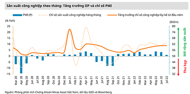 Chỉ số PMI cũng cho thấy kỳ vọng mở rộng sản xuất trong 10 tháng liên tiếp (với PMI duy trì trên 50 điểm liên tục từ tháng 10/2021). Tuy nhiên, theo S&P Global, sản lượng và số lượng đơn đặt hàng mới của tháng 7 có phần tăng chậm hơn so với tháng 6.