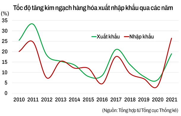 Trước đó trong năm 2021, xuất, nhập khẩu của Việt Nam tăng trưởng lần lượt là 19% và 26,5%, theo báo cáo kinh tế năm từ Tổng cục Thống kê.
