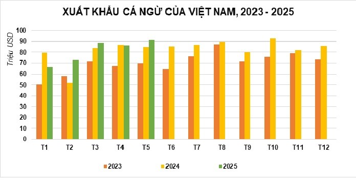 Theo Hiệp hội Chế biến và xuất khẩu thủy sản Việt Nam (VASEP), tháng 5/2025, kim ngạch xuất khẩu cá ngừ của Việt Nam có sự phục hồi nhẹ với +8% so với cùng kỳ năm trước (YoY), đạt hơn 91 triệu USD – là mức cao nhất kể từ đầu năm.