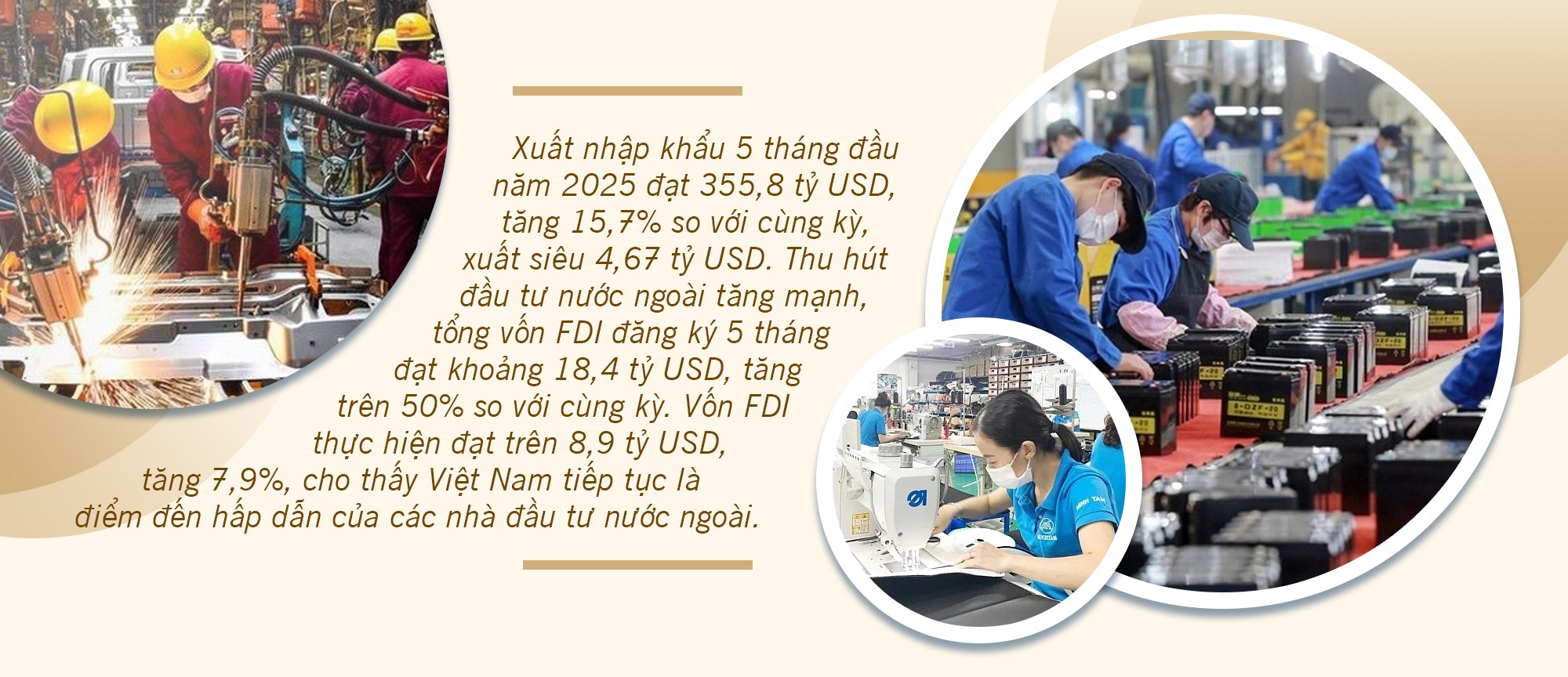 Theo Báo cáo của Bộ Tài chính về tình hình kinh tế - xã hội, 5 tháng đầu năm 2025, nền kinh tế tiếp tục tăng trưởng ổn định cả ở 3 khu vực nông nghiệp, công nghiệp, dịch vụ. Sản xuất công nghiệp, tiêu dùng nội địa và xuất nhập khẩu đều ghi nhận mức tăng ấn tượng so với cùng kỳ. Đặc biệt, kinh tế vĩ mô giữ được sự ổn định trong khi lạm phát được kiểm soát tốt.