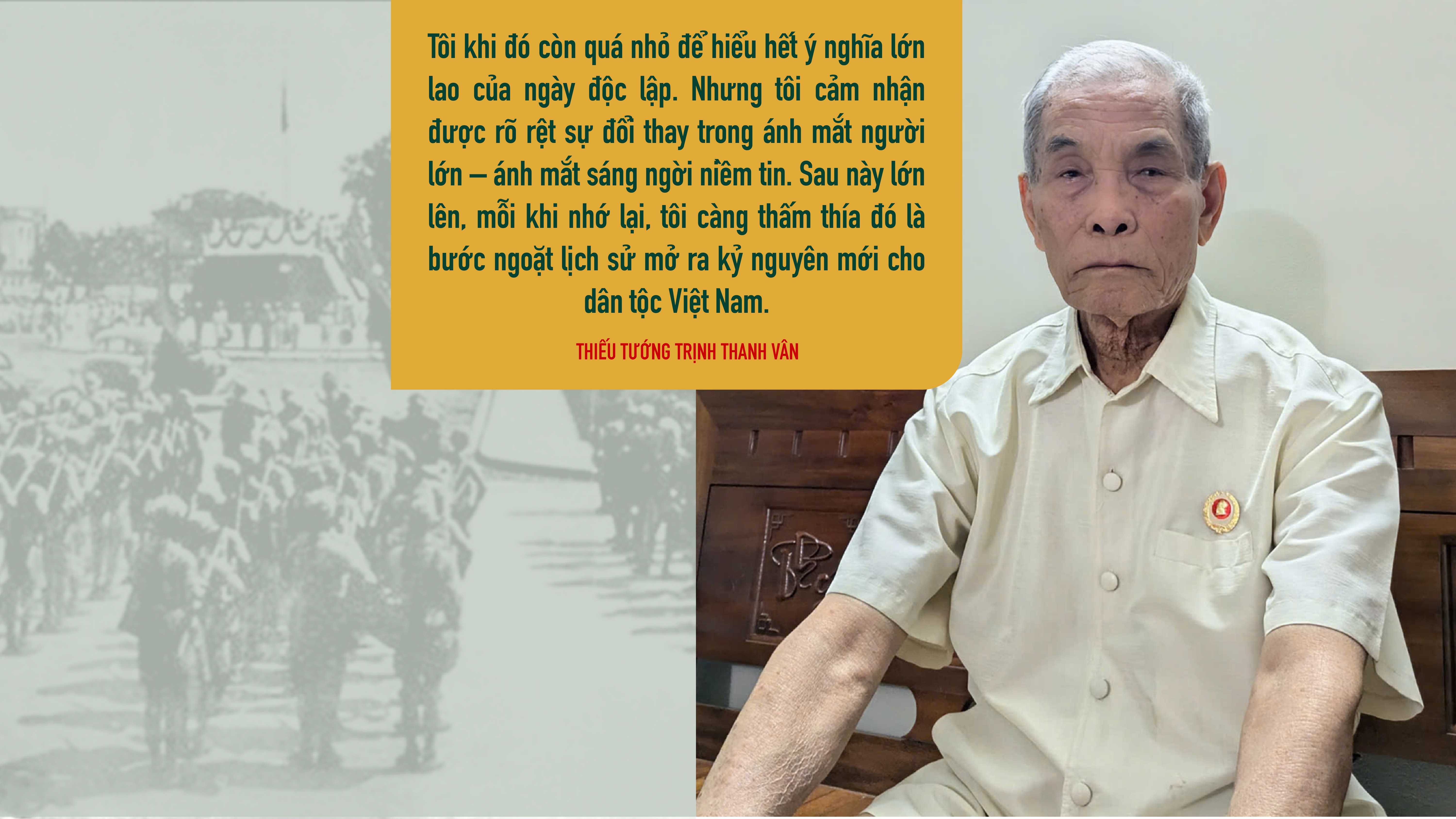 “Hôm ấy, cả làng, cả xã như bỏ hết công việc đồng áng. Mọi người tụ tập bên nhau, lắng nghe tin tức từ cán bộ mang về. Từ báo đài, chúng tôi biết rằng ở Hà Nội, Bác Hồ vừa thay mặt dân tộc đọc bản Tuyên ngôn lịch sử, khai sinh ra nước Việt Nam Dân chủ Cộng hòa (nay là nước Cộng hòa xã hội chủ nghĩa Việt Nam). Tin vui lan truyền nhanh chóng, khiến không khí nơi thôn dã cũng vỡ òa như ngày hội,” Thiếu tướng Trịnh Thanh Vân xúc động nhớ lại.