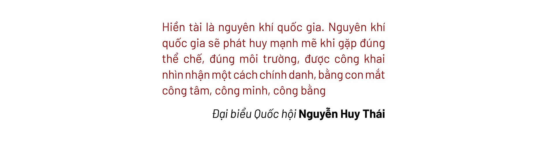 Theo ông Thái, bộ máy chính quyền địa phương hai cấp đang dần vận hành trơn tru. Đây chính là thời điểm thích hợp để thiết lập lại cơ chế tuyển dụng, sử dụng, đánh giá... cán bộ, công chức nói chung, người tài nói riêng, nhất là những người trẻ tuổi. Vị đại biểu nhận định, không thể nhìn nhận “người tài” thuần túy là người có năng lực vượt trội trong một lĩnh vực chuyên môn cụ thể (tri thức, kĩ năng, khả năng sáng tạo, năng lực lãnh đạo, tư duy chiến lược…), mà còn bao hàm cả đạo đức và tinh thần phụng sự cộng đồng, xã hội. Đó phải là người linh hoạt ứng dụng, vận dụng, sử dụng tài năng của mình tạo ra giá trị cho cộng đồng, cho đất nước. Đồng thời góp phần tạo năng lượng tích cực trong cộng đồng, lan tỏa khí chất dân tộc, bằng chính phông văn hóa cá nhân của mình.
