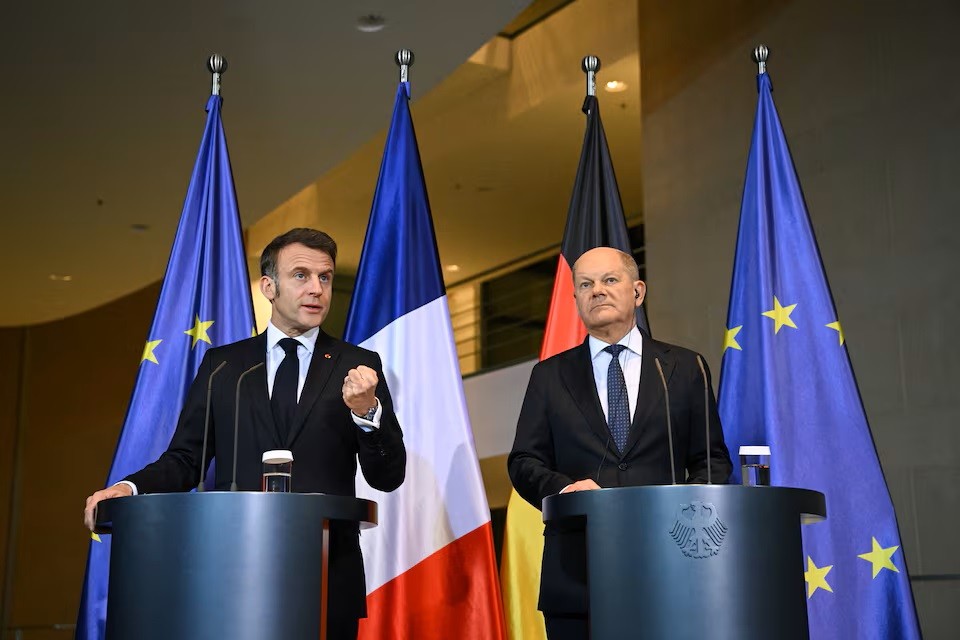| Tổng thống Pháp Emmanuel Macron và Thủ tướng Đức Olaf Scholz phát biểu với giới truyền thông sau cuộc hội đàm tại Berlin, Đức, ngày 18/3. Ảnh: Reuters |