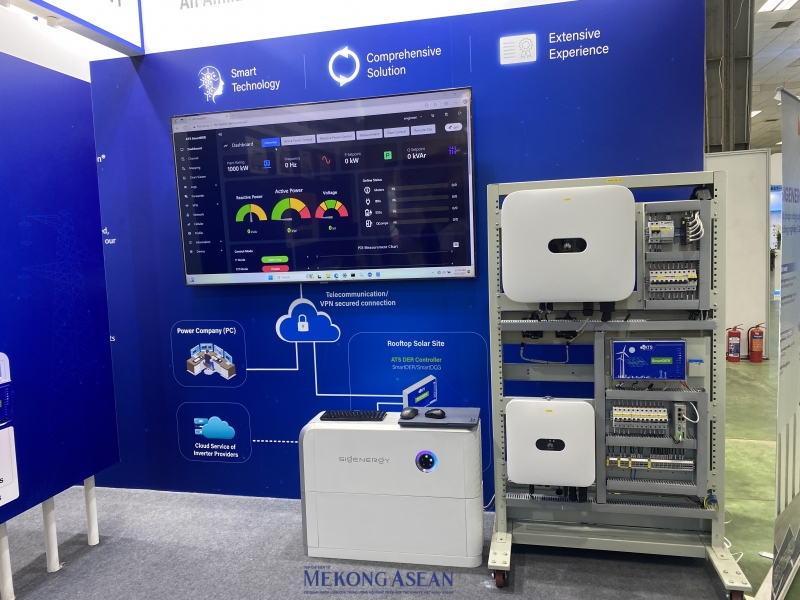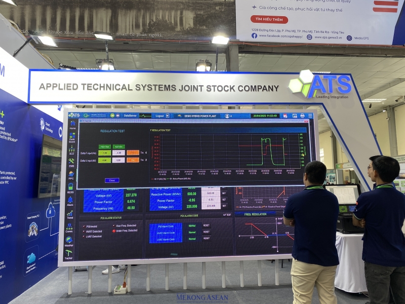 | Về lĩnh vực năng lượng xanh, CTCP hệ thống kỹ thuật ứng dụng (ATS) mang đến triển lãm hệ thống mô phỏng nhà máy năng lượng tái tạo. Hệ thống này thực hiện tất cả các chức năng thu thập, giám sát và kiểm soát dữ liệu của nhà máy điện mặt trời. Cùng với đó, hệ thống có tính năng mô-đun hoá và khả năng mở rộng, cho phép tuỳ chỉnh chức năng điều khiển nhà máy và cung cấp các chức năng cần thiết để đáp ứng nhu cầu về tính đa dạng hoá của các yêu cầu nối lưới. Giao diện người-máy (HMI) trực quan hoá tất cả các giá trị đo được cục bộ và trong thời gian thực, cho phép quản lý vận hành kỹ thuật cho các nhà máy điện mặt trời tại chỗ. Ảnh: Hà Anh/Mekong ASEAN. |