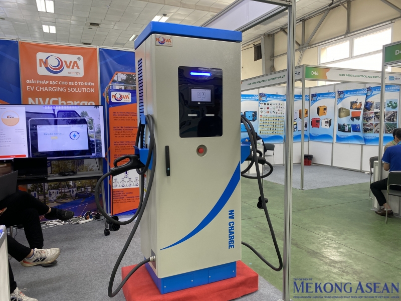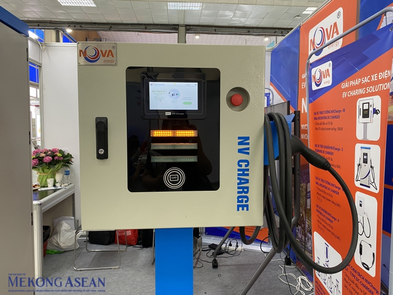 | Về hệ thống sạc, CTCP Thương mại kỹ thuật Hải Anh (Hải Anh JSC) trưng bày giải pháp sạc xe điện NVCharge, được phát triển dựa trên sự hợp tác với Viện Công nghệ điều khiển và tự động hoá (Đại học Bách khoa Hà Nội). Giải pháp sạc NVCharge gồm các dòng sản phẩm: sạc treo với công suất 30 kW, sạc tiêu chuẩn có dải công suất từ 60-320 kW, sạc chia tách X có công suất từ 240-960 kW. Giải pháp sạc NVCharge được thiết kế theo kiểu dáng công nghiệp theo các tiêu chuẩn an toàn như vỏ trụ sạc IP54, cổng sạc chuẩn CCS2 cho phép sạc AC/DC trên cùng một cổng… Ảnh: Hà Anh/Mekong ASEAN. |