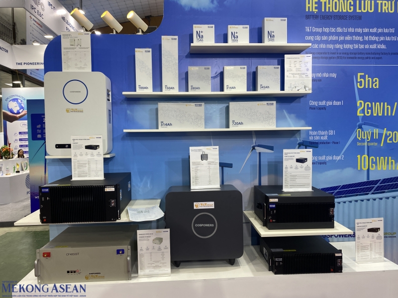 | Liên danh giữa CTCP Tập đoàn T&T (T&T Group) và nhà sản xuất pin lưu trữ Cospowers của Trung Quốc, giới thiệu sản phẩm pin lưu trữ năng lượng mới với tế bào pin ứng dụng công nghệ xếp lớp dạng chữ Z tốc độ cao. Ảnh: Hà Anh/Mekong ASEAN. |