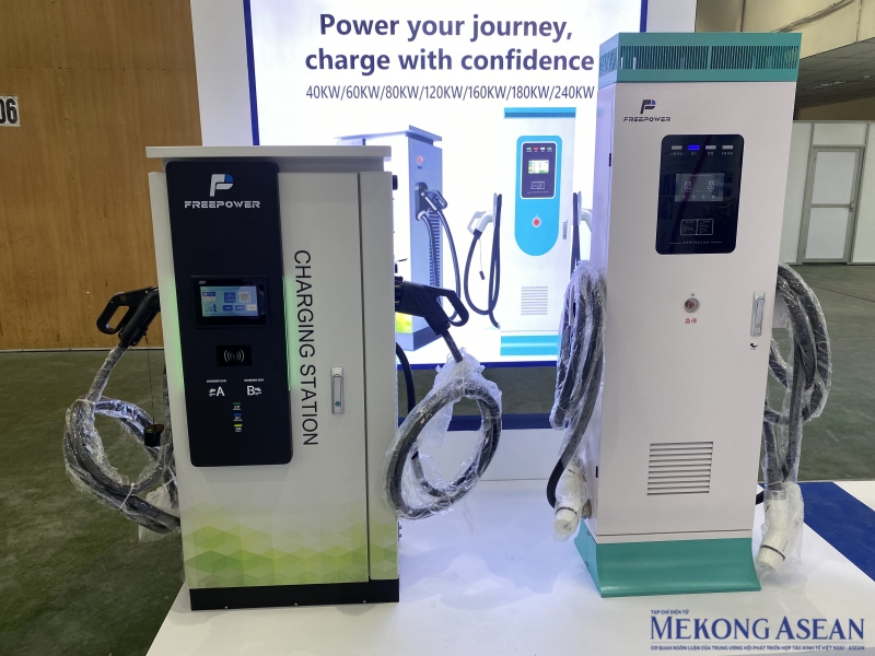 | Tại sự kiện còn có sự tham dự của doanh nghiệp quốc tế. Công ty Ningbo Freepower New Energy của Trung Quốc giới thiệu nhiều sản phẩm pin sạc xe điện. Trạm sạc điện DC có công suất từ 40-240kW, được thiết kế dành cho các hộ gia đình. Ảnh: Hà Anh/Mekong ASEAN. |