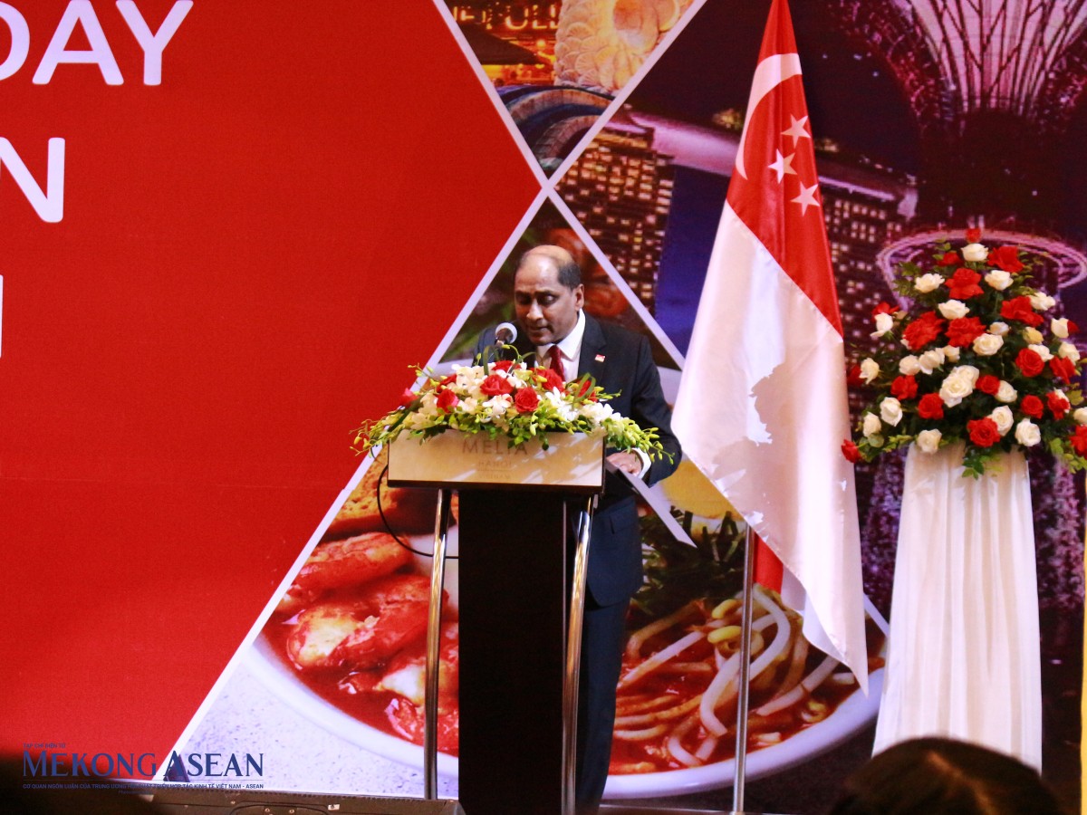 | Đại sứ Singapore Jaya Ratnam phát biểu tại sự kiện. Ảnh: Võ Quyền - MekongASEAN |