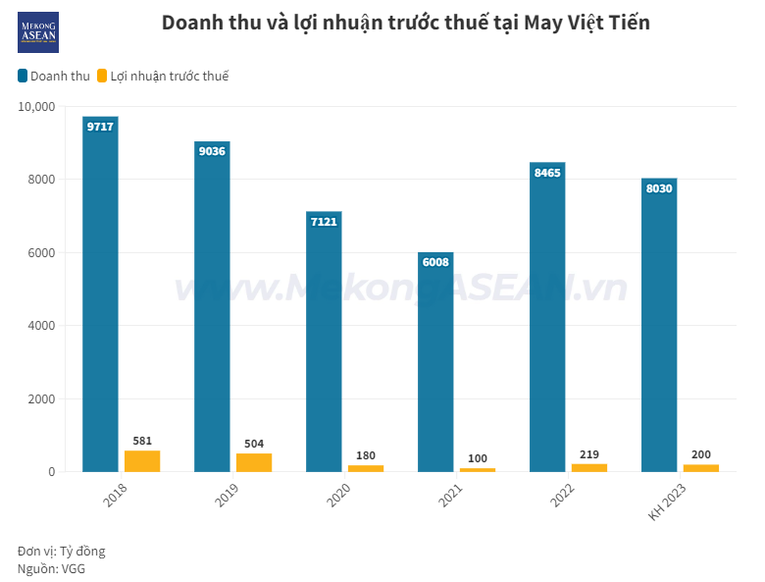 Trên cơ sở đó, May Việt Tiến đặt kế hoạch tổng doanh thu 2023 đạt 8.030 tỷ đồng, giảm 5% so với cùng kỳ năm 2022 và lãi trước thuế 200 tỷ đồng, giảm 9% so với năm 2022.