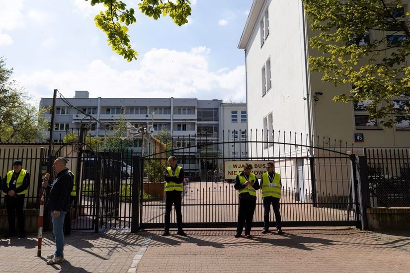 | Cảnh sát Ba Lan bên ngoài trường học của Đại sứ quán Nga ở thủ đô Warsaw, ngày 29/4. Ảnh: Reuters |