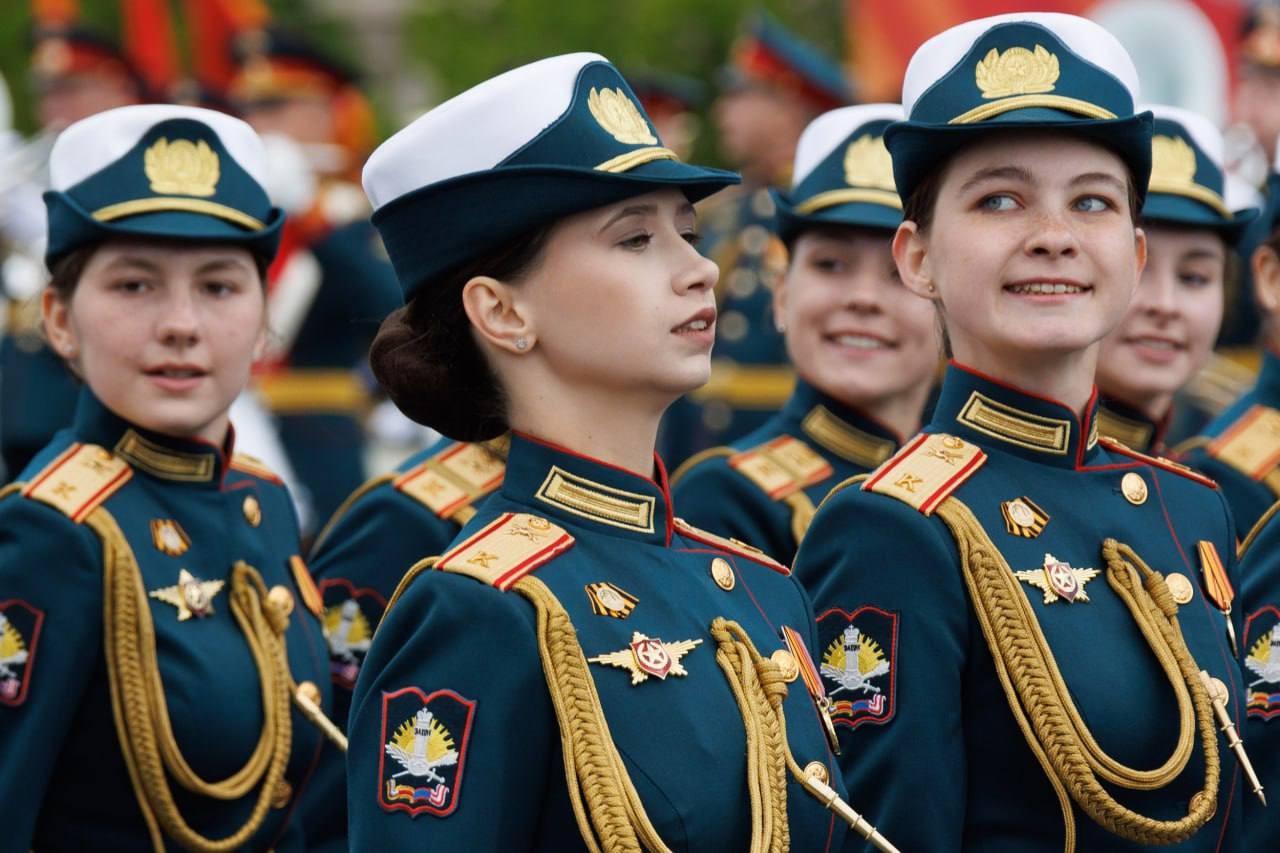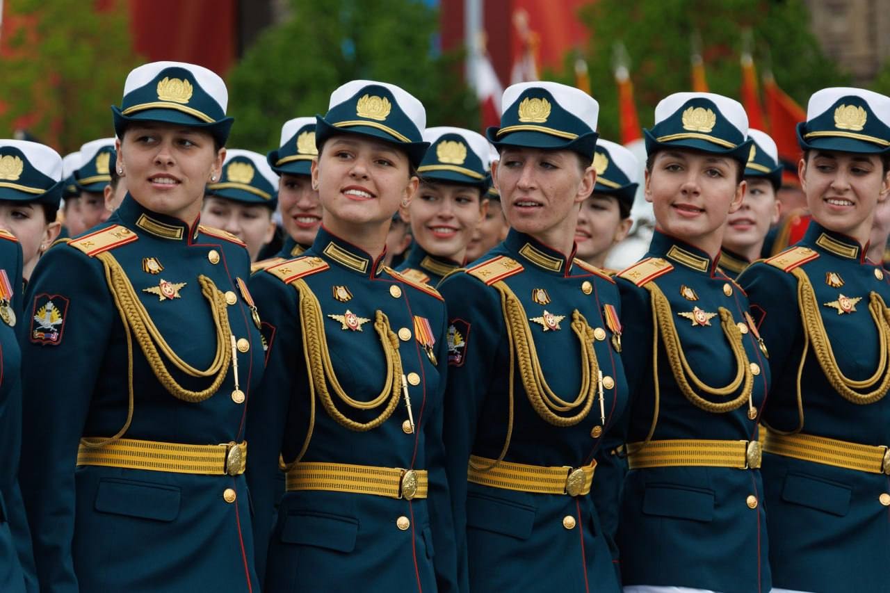 | Đội hình diễu hành của các nữ quân nhân bao gồm các chuyên gia tương lai của lực lượng liên lạc, bảo vệ hạt nhân, hóa học và sinh học, nhà tâm lý học, phiên dịch viên, luật sư và chuyên gia tài chính. Ảnh: Bộ Quốc phòng Nga |