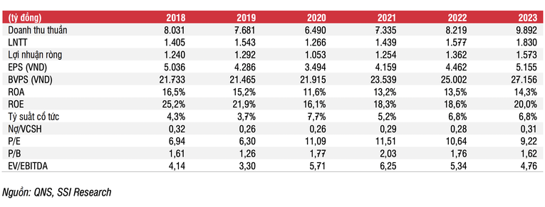 SSI ước tính doanh thu thuần và lợi nhuận sau thuế của QNS trong năm 2022 sẽ lần lượt đạt 8.200 tỷ đồng (tăng 12% so với cùng kỳ, nhưng giảm 7% so với ước tính trước đó của SSI) và 1.400 tỷ đồng (tăng 9% so với cùng kỳ, giảm 3% so với ước tính trước đó). Năm 2023, SSI ước tính doanh thu thuần và lợi nhuận sau thuế của QNS lần lượt là 9.900 tỷ đồng (tăng 20% so với cùng kỳ) và 1.600 tỷ đồng (tăng 16% so với cùng kỳ).