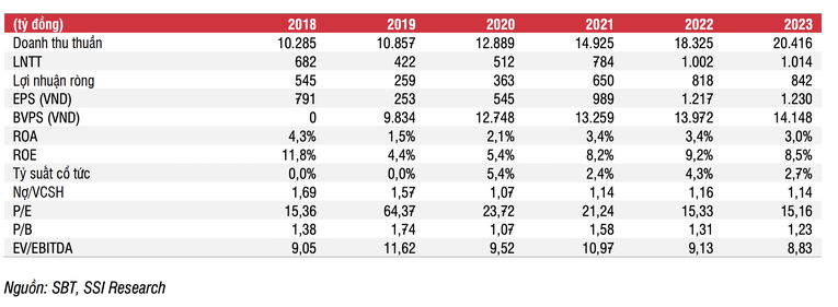 Trong năm tài chính 2023, SSI dự báo doanh thu thuần và lợi nhuận sau thuế của cổ đông công ty mẹ SBT lần lượt là 20.400 tỷ đồng (tăng 11% so với cùng kỳ) và 831 tỷ đồng (tăng 3% so với cùng kỳ). Kết quả này dựa trên các giả định: Sản lượng tiêu thụ đi ngang, với tổng lượng đường tiêu thụ là 1,1 triệu tấn. 60% sản lượng đường của công ty sản xuất từ mía và 40% còn lại sản xuất từ đường thô và đường thương mại.