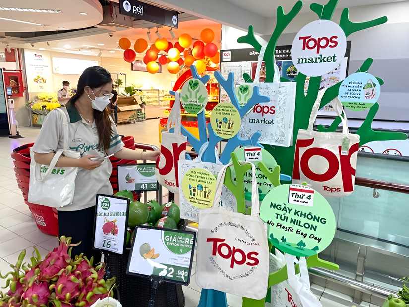 Các siêu thị Tops Market trên toàn quốc cũng đang trên lộ trình hoàn toàn chấm dứt cung cấp túi ni lông trong thời gian tới. Tiêu biểu như việc lắp đặt các mô hình “Cá voi ăn rác thải nhựa” ở khắp các bãi biển Việt Nam.