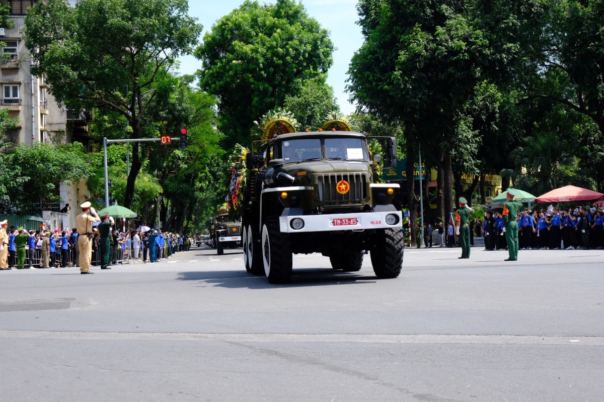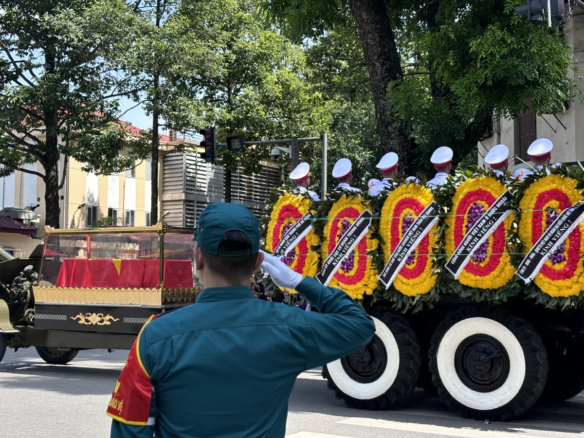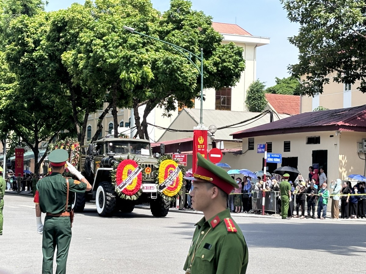 | Cỗ linh xa chở linh cữu Tổng Bí thư Nguyễn Phú Trọng đi qua tuyến đường Trần Phú. Ảnh: Thu Trang/Mekong ASEAN |