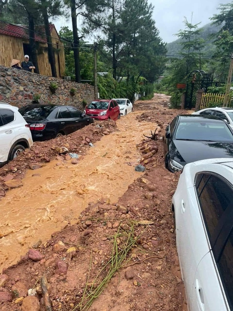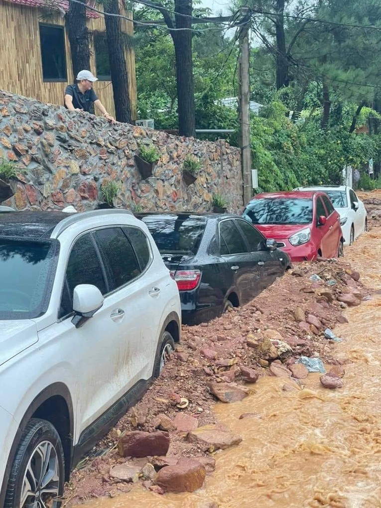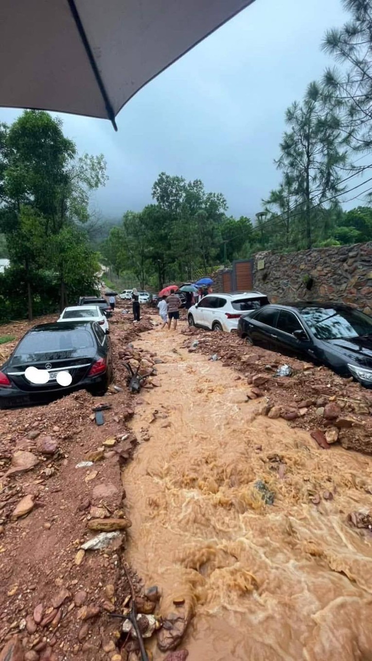 Theo những hình ảnh được khách du lịch đăng tải trên Facebook, nước mưa chảy khá siết. Đất đá bị xói lở trên đường ven hồ Ban Tiện khiến nhiều ô tô bị mắc kẹt, không thể nhúc nhích. Có phương tiện bị đất đá làm ngập đến hơn bánh xe ô tô...