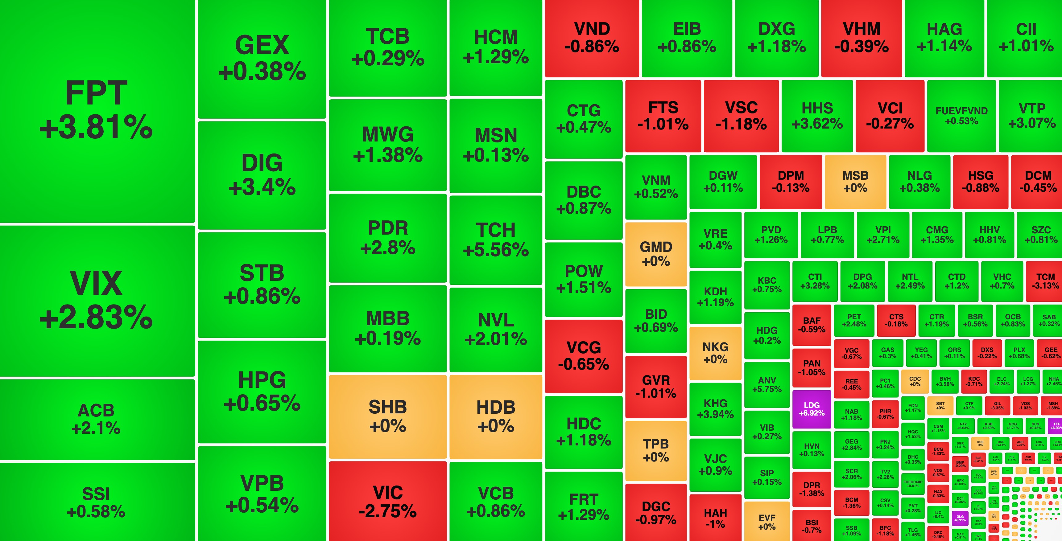 VN30 tăng gần 8 điểm lên mốc 1.488,77 điểm, chứng kiến sự đối lập giữa 2 cổ phiếu lớn FPT và VIC. Trong khi FPT có đóng góp lớn nhất cho mức tăng của chỉ số với mức tăng 3,8% thì VIC lại là mã tác động tiêu cực nhất, với mức giảm 2,8%.