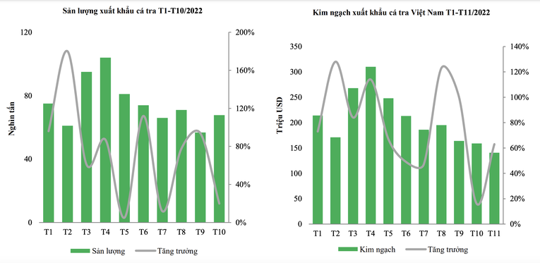 Sản lượng cá tra của Việt Nam từ tháng 1 đến tháng 10/2022 hầu như đều tăng trưởng hơn 60% so với năm 2021. Tuy nhiên, sản lượng và kim ngạch xuất khẩu trong quý 3/2022 giảm lần lượt là 25% và 33% so với quý 2/2022.